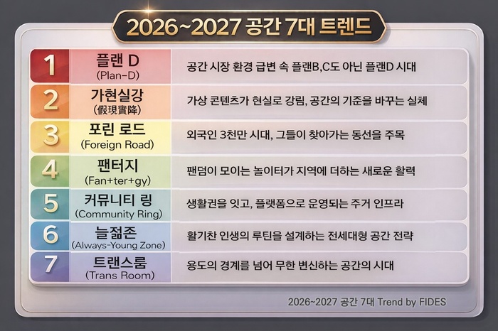 피데스개발은 ”2025 미래주택 소비자 인식조사, 전문가 자문, 국내외 트렌드와 데이터 분석을 종합해 △플랜 D(Plan-D) △가현실강(假現實降) △포린 로드(Foreign Road) △팬터지(Fan+ter+gy) △커뮤니티 링(Community Ring) △늘젊존(Always-Young Zone) △트랜스룸(Trans Room)을 ‘2026~2027년 공간 7대 트렌드’로 선정했다고 6일 밝혔다. 피데스개발은 2009년부터 주거·도시·공간 트렌드를 정기적으로 분석·발표해 왔다.