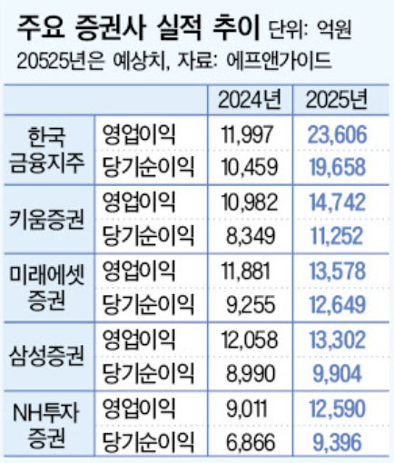 6일 에프앤가이드에 따르면 한국금융지주(한국투자증권)와 키움·미래에셋·삼성·NH투자증권 등 유가증권시장 상장 증권사의 2025년 영업이익 추정치는 모두 1조원을 넘어섰다.