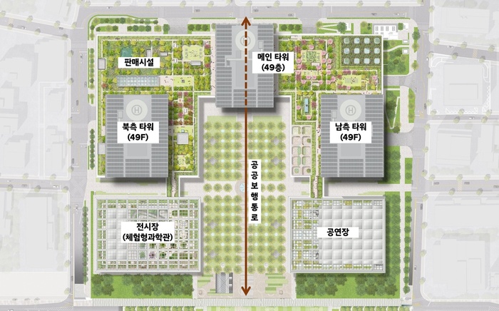 이번 개발 테마 중 하나는 ‘공공성’이다. GBC 중앙에는 영동대로와 지상 광장을 연결하는 1만 4,000㎡ 규모의 '도심숲'이 조성된다. 이는 서울광장(1만 3,207㎡)보다 큰 규모로, 민간 복합단지 내 녹지 공간으로는 국내 최대 수준이다. 영동대로 상부 광장까지 합치면 서울광장의 약 2배에 달하는 녹지축이 강남 한복판에 형성된다.