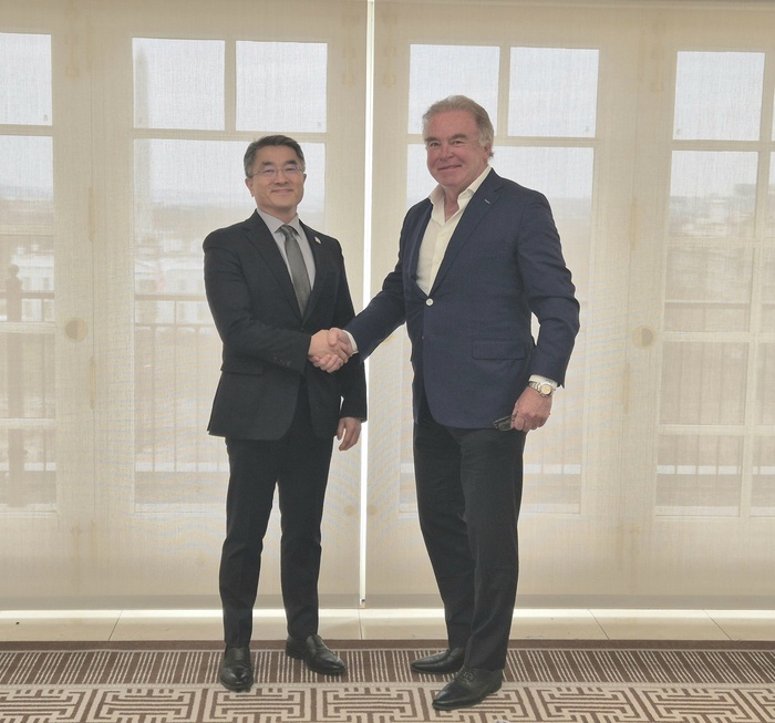 | (사진 왼쪽부터) 남궁홍 삼성E&A 사장과 사이먼 그린쉴즈(Simon Greenshields) 와바시 밸리 리소스 이사회 의장이 지난 5일(현지시간) ‘미국 와바시 저탄소 암모니아 프로젝트’의 착공식 후 기념촬영을 하고 있다. /사진: 삼성E&A 제공 |