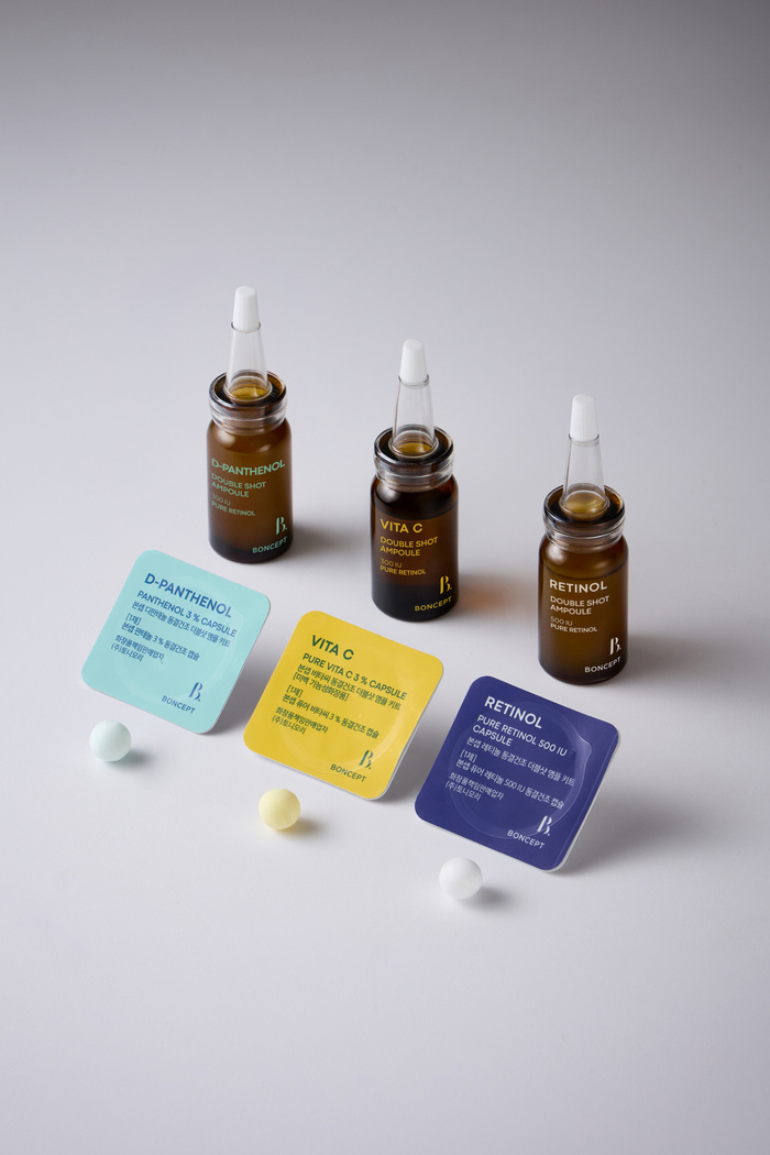 신제품은 지난해 다이소몰 미백 앰플 부문 베스트상품 1위에 오른 ‘본셉 비타씨 동결건조 더블샷 앰플 키트’의 후속으로 개발했다. 레티놀 동결건조 더블샷 앰플 키트는 순수레티놀 500IU앰플에 순수 레티놀 500IU과 콜라겐 70%가 함유된 동결건조 볼을 조합해 모공 탄력을 관리해준다. 레티놀 더블 브이핏 겔 마스크는 레티놀 60ppb가 함유된 고탄성 원단으로 얼굴 라인을 관리해준다. D-판테놀 동결건조 더블샷 앰플 키트는 판테놀 3% 동결건조 볼을 순수 레티놀 300IU 앰플에 넣어 사용하는 DIY 앰플이다.