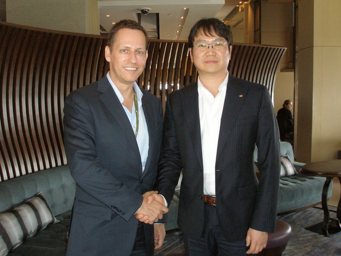 | 피터 틸 팔란티어 창업자와 곽동신 한미반도체 회장. /사진: 한미반도체 제공 |