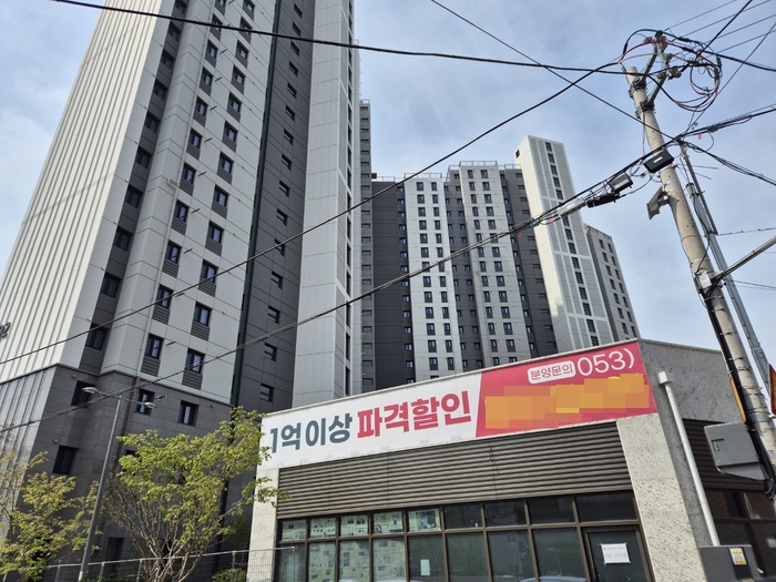 | ‘미분양의 무덤’으로 불리는 대구의 한 미분양 아파트 단지에 ‘1억원 이상 파격할인’이라는 광고물이 붙어 있다. / 사진: 대한경제DB |