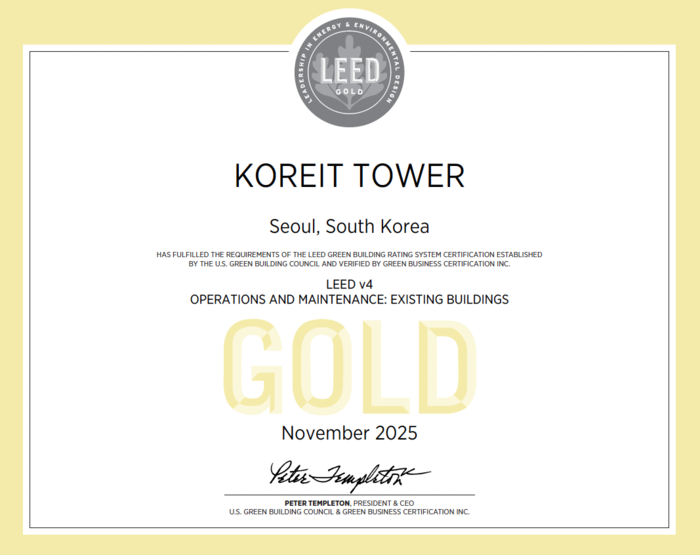 LEED 인증은 미국그린빌딩위원회(USGBC)가 제정한 친환경 건축물 인증제도다. 코레이트타워는 LEED의 인증 중에서도 O+M부문인 ‘기존건물 운영ㆍ유지관리(Operations and Maintenance: Existing Buildings)’에서 골드(Gold) 등급 인증을 획득했다. 특히 O+M 인증은 ‘실제 운영 성과’를 중심으로 평가한다는 점에서 자산의 지속가능한 관리 수준을 가늠하는 핵심 지표로 활용된다.