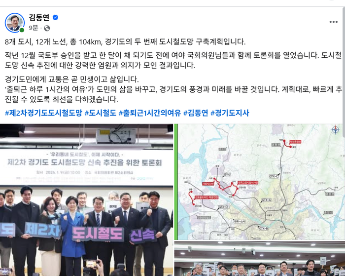 | 김동연 지사가 페이스북을 통해 경기도의 두 번째 도시철도망의 빠른 구축을 강조하고 있다. / 사진 : 김동연 지사 SNS |