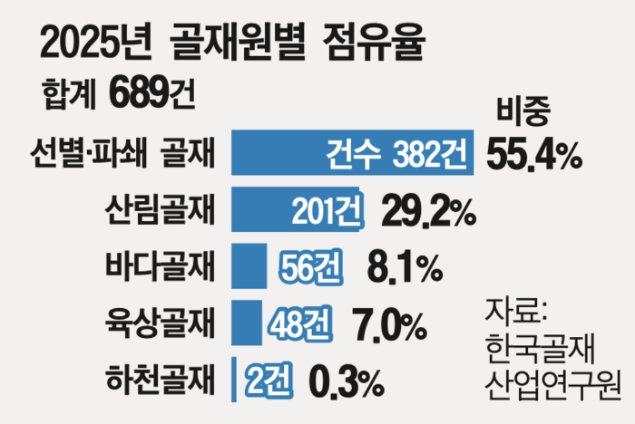 반면 과거 골재의 대명사였던 하천골재는 단 2건(0.3%)에 불과해 사실상 명맥이 끊긴 것으로 나타났다. 바다골재(56건, 8.1%)와 육상골재(48건, 7.0%) 역시 지역적 한계를 벗어나지 못했다. 골재 수급의 중심축이 자연 채취에서 채석ㆍ가공 중심의 산업적 공급 구조로 재편되는 흐름을 보였다.