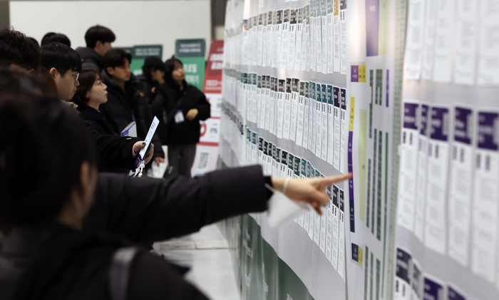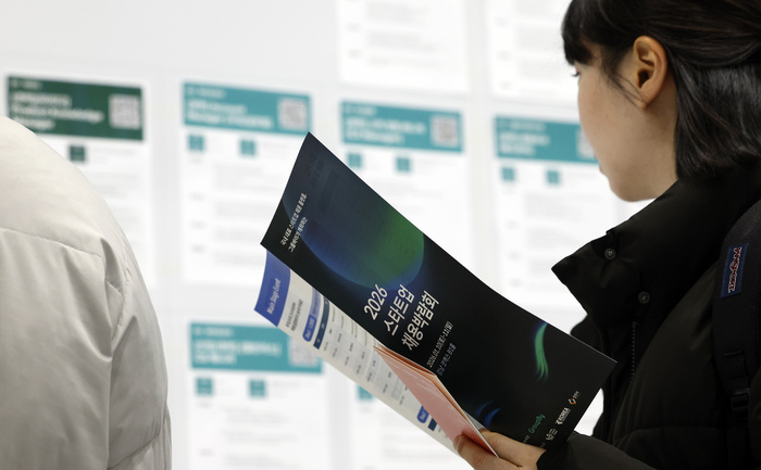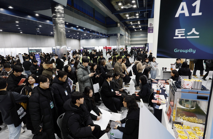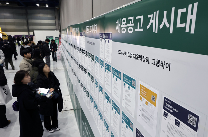 11일 서울 강남구 코엑스에서 열린 ‘2026 스타트업 채용박람회’를 찾은 구직자들이 채용정보를 살펴보고 있다. 이번 박람회에는 토스, 뱅크샐러드, 화이트큐브, 모두닥, 말해보카 등 총 80개 스타트업이 참가해 대면 상담과 면접을 진행했다 .