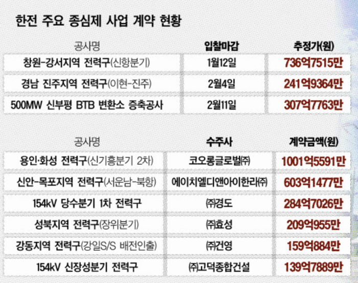 단일 계약 중 가장 큰 규모는 코오롱글로벌이 수주한 ‘용인ㆍ화성 전력구(신기흥분기 2차)’ 공사로, 계약금액은 1001억5591만원이다. 반도체 클러스터 등 경기 남부권 전력 수요에 대응하기 위한 핵심 기반 시설로 꼽힌다.