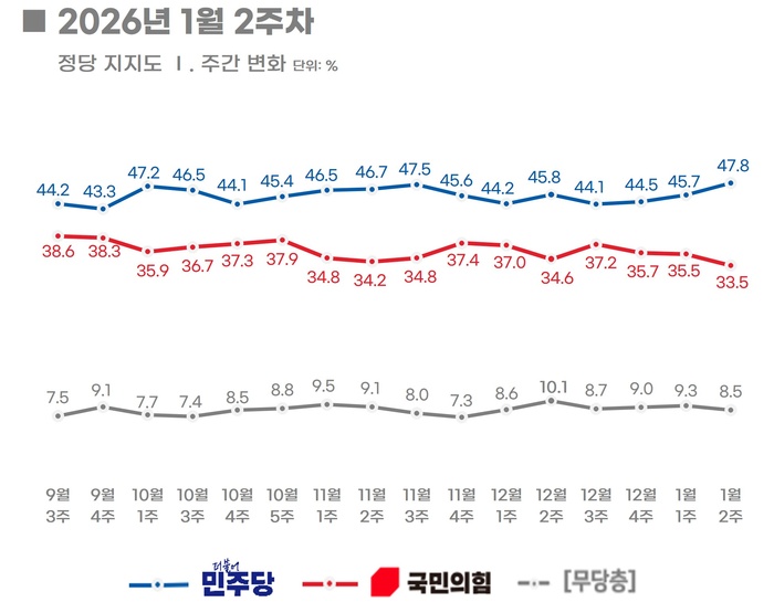 정당지지도 조사(8∼9일 전국 18세 이상 1006명 대상 실시, 표본오차 95% 신뢰수준에 ±3.1%p, 응답률 4.1%)에서도 여당인 더불어민주당이 전주 대비 2.1%p 상승한 47.8%를 기록했다. 반면 국민의힘은 2.0%p 하락한 33.5%였다. 양당 간 격차는 전주 10.2%p에서 14.3%p로 확대됐다.