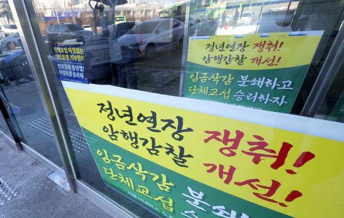 서울 시내버스가 노사 협상 결렬로 총파업에 돌입한 13일 서울 양천구 공영차고지에 노조측의 요구안이 적힌 피켓이 붙어 있다. 노조는 이번 협상에서 임금 3% 인상과 정년 65세로 연장, 임금 차별 폐지를 요구했다.