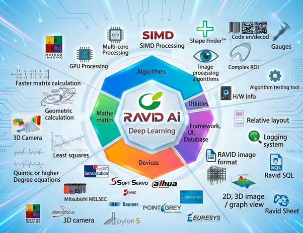 라비드 AI는 규칙 기반 검사(룰베이스)와 딥러닝 기반 판정을 하나의 시스템에서 운용하는 하이브리드 AI 비전 솔루션이다. 치수 측정이나 정렬처럼 정량 기준이 필요한 영역은 룰베이스 방식으로 처리하고, 스크래치·이물·조명 변화 등 비정형 결함은 딥러닝으로 판단하는 구조다. 이를 통해 정밀 계측과 비정형 판정이 동시에 필요한 제조 공정과 로봇 비전 환경에 적용할 수 있도록 했다.