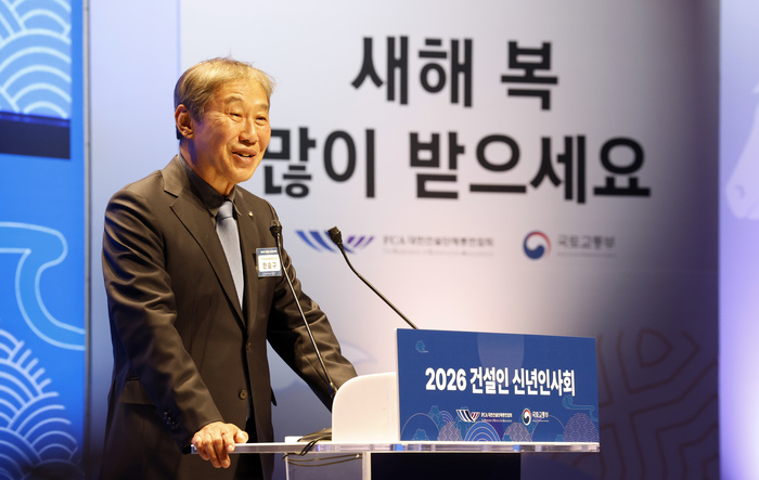 한승구 대한건설단체총연합회장이 14일 서울 강남구 건설회관에서 열린 ‘2026 건설인 신년인사회’에서 신년 인사말을 하고 있다.