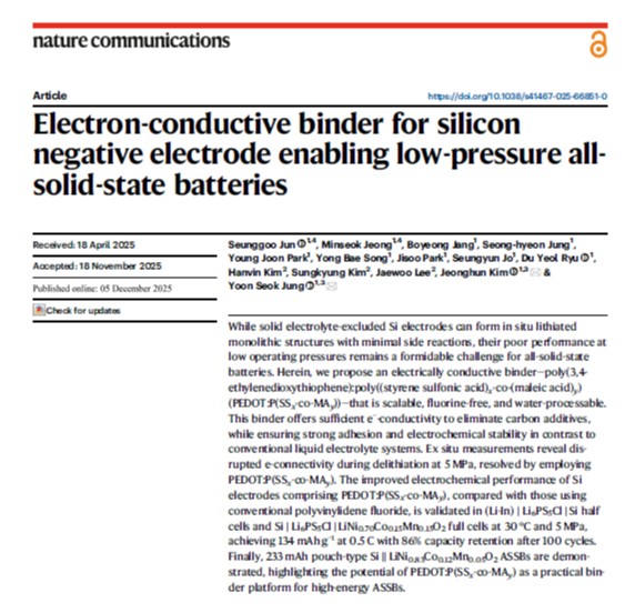 [대한경제=이계풍 기자] SK온은 연세대 정윤석·김정훈 교수팀과 실리콘 음극 전고체 배터리에 최적화된 신소재 바인더 ‘전자전도성 고분자(PPMA)’를 개발했다고 15일 밝혔다. 이번 연구는 국제 학술지 ‘네이처 커뮤니케이션스’에 지난해 12월 5일 게재됐다.