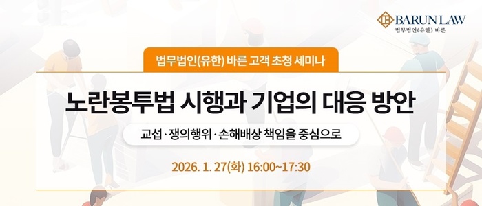 [대한경제=이승윤 기자] 법무법인 바른은 오는 27일 오후 4시 서울 강남구 섬유센터 2층 컨퍼런스홀에서 ‘노란봉투법 시행과 기업 대응 방안’을 주제로 세미나를 개최한다고 15일 밝혔다.
