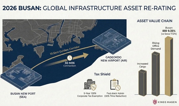 보고서는 가덕도신공항(GNA)과 부산항 신항, 배후 철도망이 결합된 ‘트라이포트(Tri-Port)’ 시너지를 부산 자산 가치 상승의 핵심 동인으로 꼽았다. 세계 2위 환적항인 신항과 가덕도신공항 사이의 거리는 단 10.5km로, 30분 이내에 해상 화물이 항공 터미널로 연계되는 독보적인 복합 물류 체계를 구축하게 된다. 킹스마겐은 이러한 인프라 실체화가 과거 송도와 마곡의 사례처럼 정보 비대칭이 해소되는 시점에 폭발적인 자본 이득(Capital Gain)으로 이어질 것이라 전망했다.