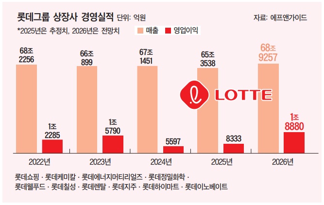 [대한경제=문수아 기자] 롯데그룹이 사업군별 전략적 리밸런싱을 통해 수익성 기반 경영으로 전환하며 올해 뚜렷한 실적 반등을 예고하고 있다. 유통과 식품 등 핵심 사업군이 선결 과제를 해결하며 내실을 다지는 가운데, 시장에서는 그룹 전체 매출과 영업이익이 동반 회복되는 선순환 구조에 진입할 것으로 내다보고 있다.