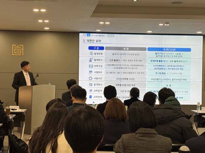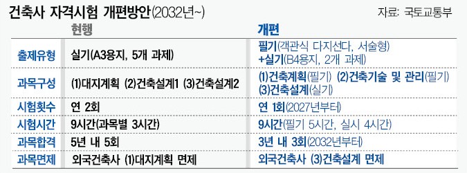 한편 국토부는 올해 개편안에 대한 심의를 마무리한 뒤 최종안을 확정하고, 관계 법령 개정에 착수할 계획이다. 이후 2029년부터 개편 내용을 단계적으로 알리고, 이를 토대로 2030년 출제 기준을 정해 2032년부터 개편된 건축사 자격시험을 본격 시행한다는 구상이다. 현행 자격시험은 2031년을 끝으로 종료된다.