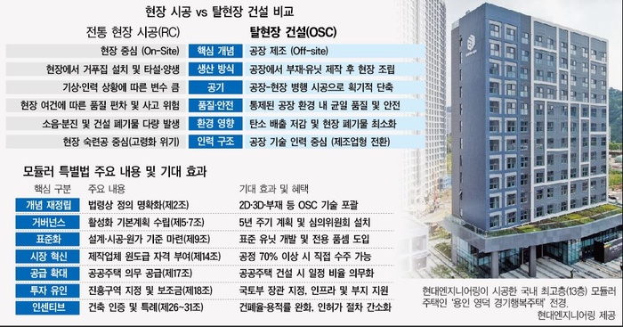 특별법은 모듈러 건축기술의 정의를 공장 등 현장 외 장소에서 건축물의 전부 또는 상당 부분을 사전 제작해 현장에서 조립ㆍ설치하는 방식으로 규정했다. 기존의 3차원 입체 모듈로 협소하게 해석되던 정의를 확장해 2차원 패널, 3차원 유닛, 1차원 부재까지 모두 포괄하는 개념으로 재정의했다. 또한 철골, 콘크리트, 목재, 복합재 등 재료에 상관없이 표준화ㆍ규격화된 부재를 공장에서 제작해 현장에서 조립하는 생산 방식으로 개념을 재정립했다.