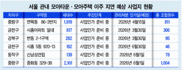 이외에도 금천구 시흥아파트 일대 △강북구 번동 2-1구역 △시흥5동 △동작구 신남성연립 등 이주 예정지들 또한 지연 우려가 큰 것으로 평가됐다.