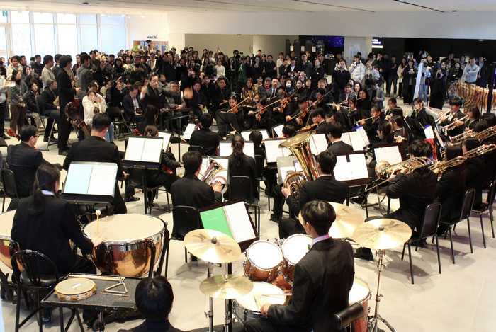 | 지난 20일 GS아트센터 로비 스테이지에서 무지개 오케스트라의 '2026년 무지개상자 런치 연주회'가 열렸다./사진=GS리테일 |