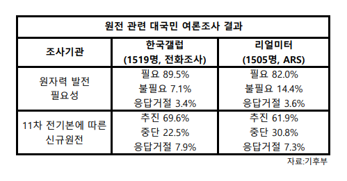 먼저, 11차 전기본상 신규원전 계획에 대한 조사 결과 응답자 10명 중 6∼7명은 ‘추진돼야 한다’고 답했다. 한국갤럽 조사에서는 69.6%가 추진 의사를 밝혔으며, 리얼미터에서는 61.9%가 같은 의견을 나타냈다. 반면, ‘중단돼야 한다’는 응답은 각 22.5%, 30.8%에 그쳤다.