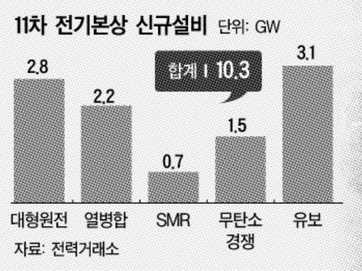 신재생에너지를 제외하고, 2038년까지 필요한 신규 발전설비는 총 10.3GW다. 11차 전기본에서는 대형원전 2기(2.8GW)를 2037∼2038년 건설하도록 계획했다. 나머지 7.5GW는 열병합(2.2GW)ㆍ소형모듈형원전(0.7GW)ㆍ수소발전 등 무탄소 전원(1.5GW)으로 채우기로 했다. 남은 3.1GW는 발전원을 확정하지 않은 유보 물량이다. 일각에서는 올해 확정될 제12차 전기본에서 이 유보 물량을 원전 추가 건설에 할당할 수 있다는 관측도 나온다.