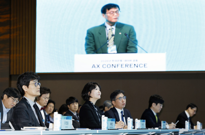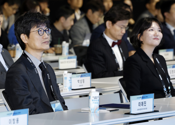 이해진 네이버 창업자 겸 이사회 의장과 최수연 네이버 대표가 21일 서울 중구 소공동 한국은행에서 열린 '2026년 한국은행·네이버 공동 AX 콘퍼런스'에서 이창용 한국은행 총재의 환영사를 경청하고 있다.