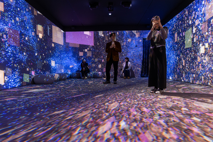 | 빛의 중정에서 관람객들이 미디어 아트를 배경으로 사진을 찍고 있다. / 사진: KT 제공 |