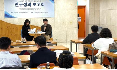 | 이웅 인천시사회서비스원 정책연구실 연구위원이 지난해 12월 부평아트센터에서 열린 ‘2025 장애인 지역사회 자립지원 연구 성과 보고회’에서 질문에 답변하고 있다. |