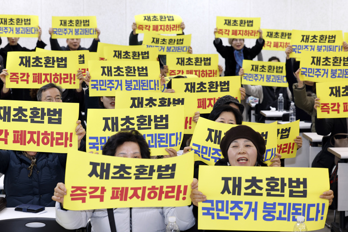 22일 서울 강남구 세텍(SETEC)에서 전국재건축정비사업조합연대 주최로 열린 ‘재건축초과이익환수법 폐지 촉구 기자회견’에서 참석자들이 재건축초과이익환수법 폐지를 촉구하는 구호를 외치고 있다.