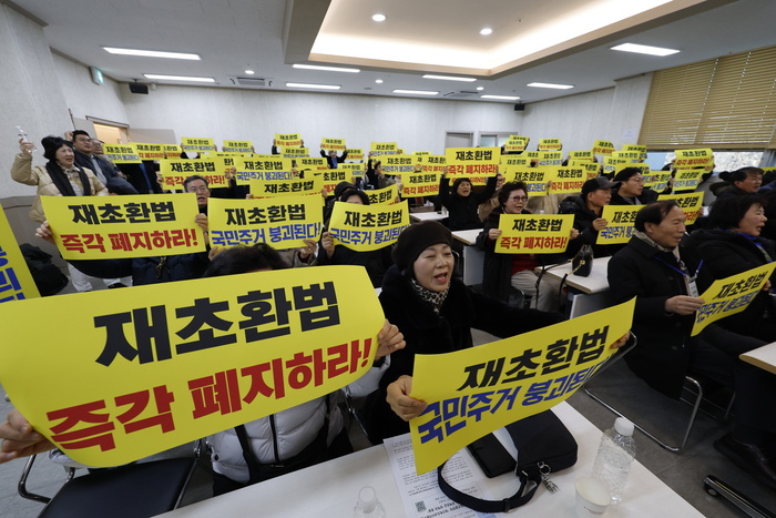 이날 기자 회견에 참석한 한 조합장은 “현재까지 재초환 부담금 산정이 이뤄지지 않는 것은 제도의 한계를 보여주는 것”이라면서 “집행 불능 상태의 법률로 민생 주거 정책이 흔들려서는 안 된다”고 강조했다.