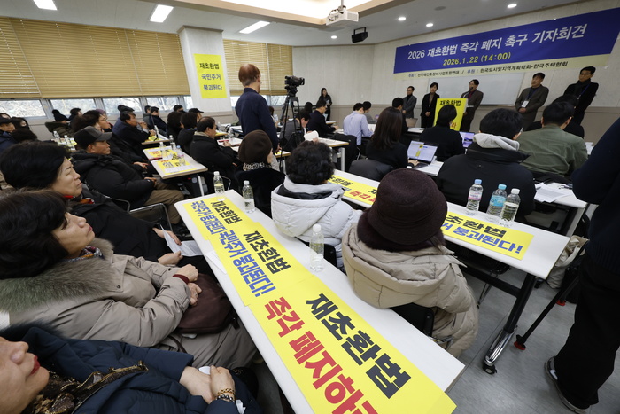 전국재건축정비사업조합연대(전재연)는 22일 서울 강남구 세텍(SETEC) 컨벤션센터에서 기자 회견을 열고 재초환의 즉각적인 폐지를 정부와 국회에 공식 요구했다.
