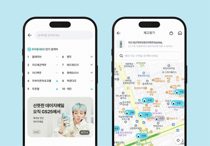| 우리동네GS 앱의 검색 메뉴(왼쪽)와 재고찾기 메뉴./이미지=GS리테일 |