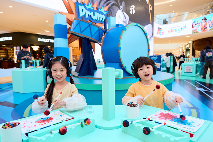 | 스타필드 고양이 '예스 두들 시즌4'에서 어린이 모델들이 드럼 두들을 체험하고 있다./사진=신세계프라퍼티 |