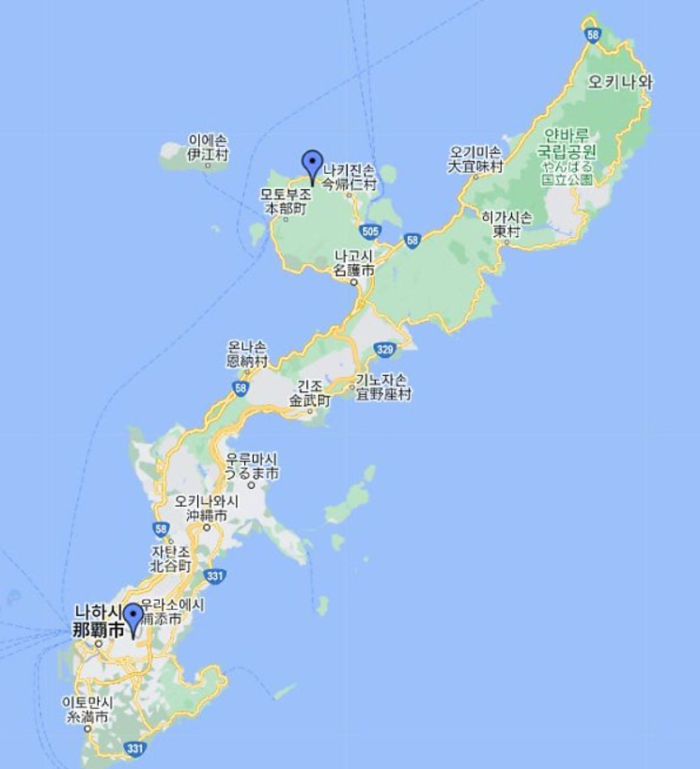 | 남북으로 길어 들어져 있는 오키나와 지형. |