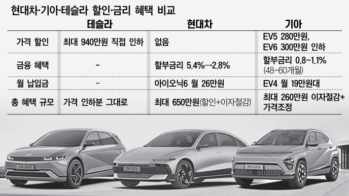 현대차ㆍ기아 모두 금리인하 등으로 월 납입 부담을 줄이는 방법을 앞세웠다. 소비자 혜택을 확대했다지만, 차량 가격 자체를 수백만원씩 깎아내렸던 테슬라의 방식과는 결이 다르다. 시장상황에 따라 혜택확대 등을 검토할 수 있으나 단기간 내 나올 가능성은 낮다는 분석이다.