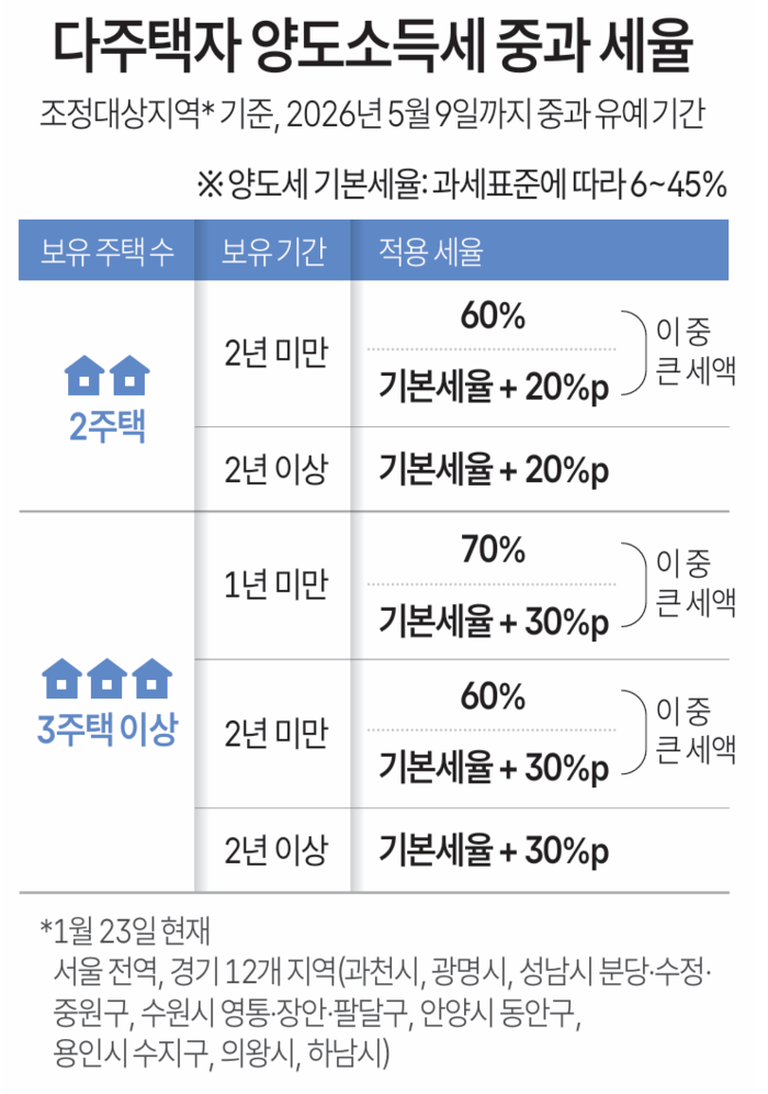 정부는 그동안 양도세 중과 유예를 놓고 신중을 기했다. 지난 21일 이 대통령은 신년 기자회견에서 “당장 세제를 통한 규제를 깊이 고려하지 않고 있다”고 언급하기도 했다. 이 때문에 시장에선 양도세 중과를 1년 더 유예하고 지방선거 이후에 1주택자 장특공제와 보유세 개편에 이어 다주택자 양도세 중과를 도입할 것으로 전망했다.