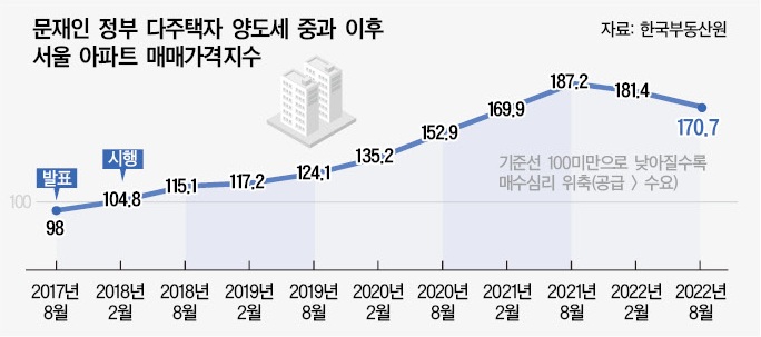 한국부동산원의 서울 아파트 매매가격지수에 따르면, 다주택자 양도세 중과가 발표된 2017년 8월 98이던 것이 제도가 시행된 2018년 2월 104.8을 기록하며 점점 가파르게 상승하더니 2019년 2월 117.2를 기록했다. 문재인 정부 말기인 2022년엔 8월엔 170.7로 폭등했다.