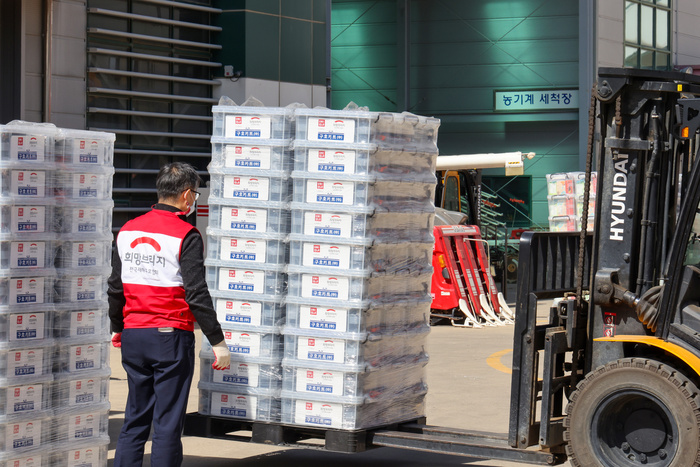 | 희망브리지가 2020년 울진 산불 당시 유니클로 후원으로 제작된 긴급구호키트를 운송하고 있다. / 사진 : 희망브리지 제공 |