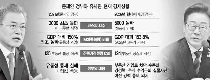 이재명 정부는 지난주 사상 최초로 코스피 5000시대를 연 데 이어, 26일에는 4년 만에 코스닥 지수도 1000포인트를 돌파했다. 이처럼 증시 부양을 통해 늘어난 국민 소득이 다시 집값 상승을 자극하지 않도록 부동산 시장 진입로를 차단하겠다는 복안이다.