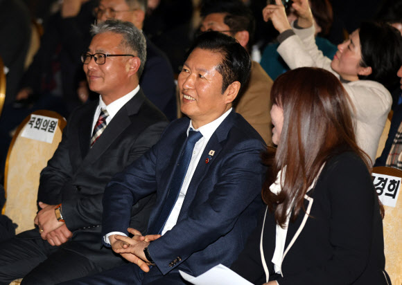 | 정청래(가운데) 더불어민주당 대표가 25일 오후 제주시 도남동 제주상공회의소 국제회의장에서 열린 청솔포럼 비전 선포식에서 홍보 영상을 보고 있다. 청솔포럼은 정 대표 지지자 모임이다./사진:연합 |