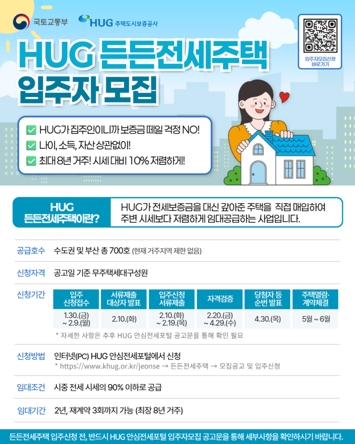 윤명규 HUG 사장직무대행은 “이번 제9차 든든전세주택 입주자 모집공고에도 많은 관심 부탁드린다”며 “올해는 공급 규모를 더욱 늘리고 품질관리도 강화하여 청년, 신혼부부 등 무주택 가구의 주거 안정을 지원하겠다”고 밝혔다.