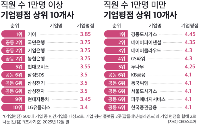 28일 기업데이터연구소 CEO스코어가 매출액 기준 500대기업을 대상으로 온라인 기업 평판 플랫폼(블라인드ㆍ잡플래닛)을 분석한 결과 직원 수 1만명 이상 민간기업 중에서는 기아가 평균 3.85로 1위를 차지했다.