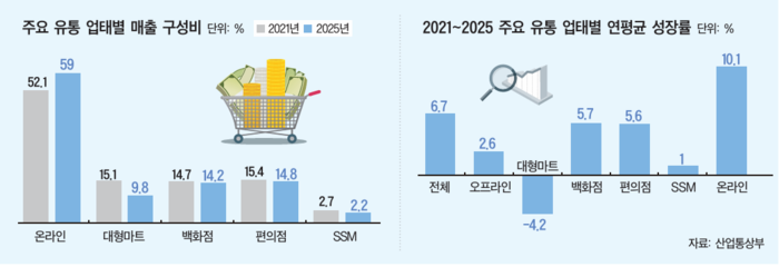 온라인 유통의 매출 비중이 커진 건 성장률 차이가 컸기 때문이다. 2021년부터 2025년까지 온라인 유통 매출 성장률은 연평균 10.1%를 기록, 유통 업태 중 가장 컸다. 전체 유통업의 성장률(6.7%)을 웃돌았다. 동시에 오프라인 유통업의 5년간 연평균 성장률(2.6%)과 3배 이상 격차를 보였다. 오프라인 업태 중 백화점(5.7%)과 편의점(5.6%)은 성장세를 이어갔고, 준대규모점포(SSM)는 1.0%의 소폭 성장에 그쳤다. 대형마트는 연평균 -4.2%로 유일하게 마이너스 성장을 기록하며 가장 큰 타격을 받았다.
