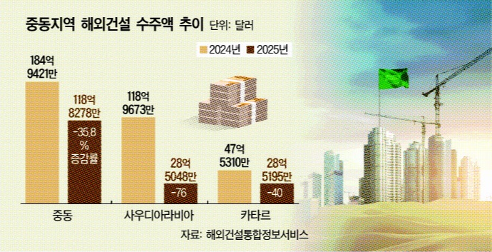 지난해 국가별 해외건설 수주액을 보면 사우디 수주액은 2024년 118억9673만달러에서 지난해 28억5048만달러로 76.0% 급감했다. 같은 기간 카타르 수주액도 47억5310만달러에서 28억5195만달러로 40.0% 줄었다.