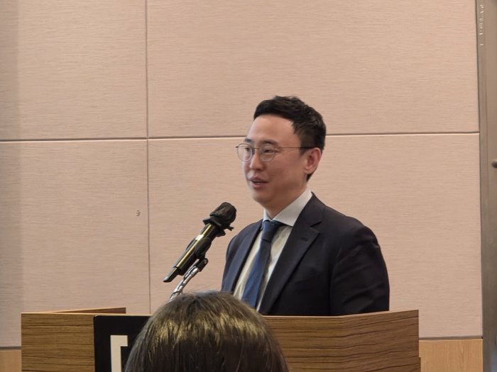 | 이재욱 AB자산운용 선임 포트폴리오 매니저가 28일 여의도 전경련회관 컨퍼런스센터에서 열린 ‘2026년 글로벌 시장 전망 기자간담회’에서 글로벌 증시 전망에 대한 발표를 진행하고 있다./사진=김동섭 기자 |