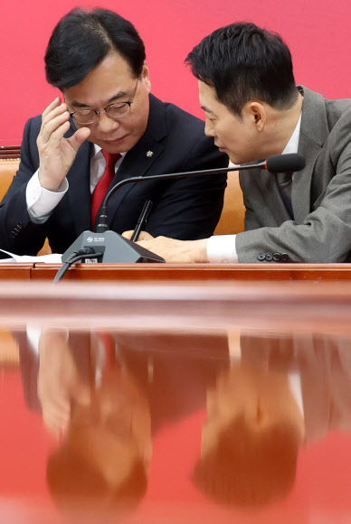 | 국민의힘 장동혁 대표와 송언석 원내대표가 29일 서울 여의도 국회에서 열린 최고위원회의에서 대화하고 있다./사진:연합 |