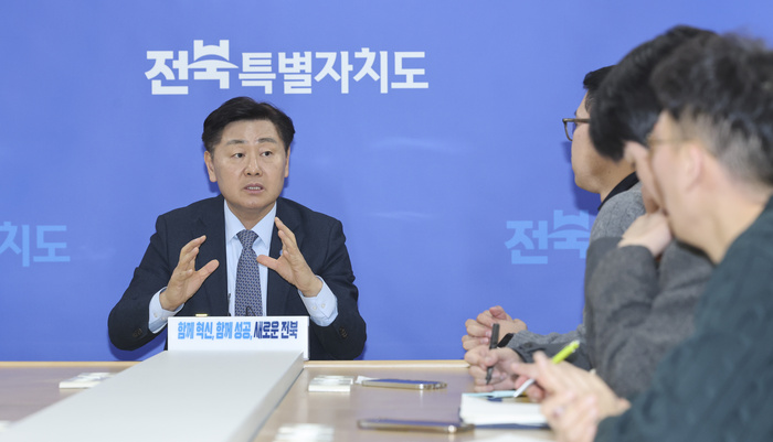 | 김관영 전북특별자치도지사가 29일 도청 브리핑룸에서 '금융중심지 지정 신청 '관련 기자간담회를 하고 있다. / 사진: 전북자치도 제공 |