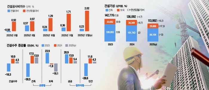 건설업체의 국내 시공실적을 금액으로 보여주는 동행지표 건설기성은 지난해 들어 1998년 통계 작성 이후 가장 크게 감소한 것으로 나타났다. 지난해 건설기성은 113조9920억원으로 잠정집계됐는데, 2024년(136조920억원) 대비 16.2% 감소한 수준이다. 이는 글로벌 금융위기 시절인 2008년(-8.1%)보다 마이너스폭이 2배에 달한다. 건설기성은 지난 2023년(142조7760억원)부터 2년 연속 감소폭을 확대하고 있다.