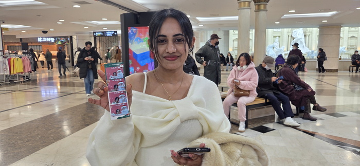 | 한 외국인이 서면지하도상가 중앙몰에서 인생네컷 사진을 들고 기념촬영을 하고 있다. / 사진 : 부산시설공단 제공 |